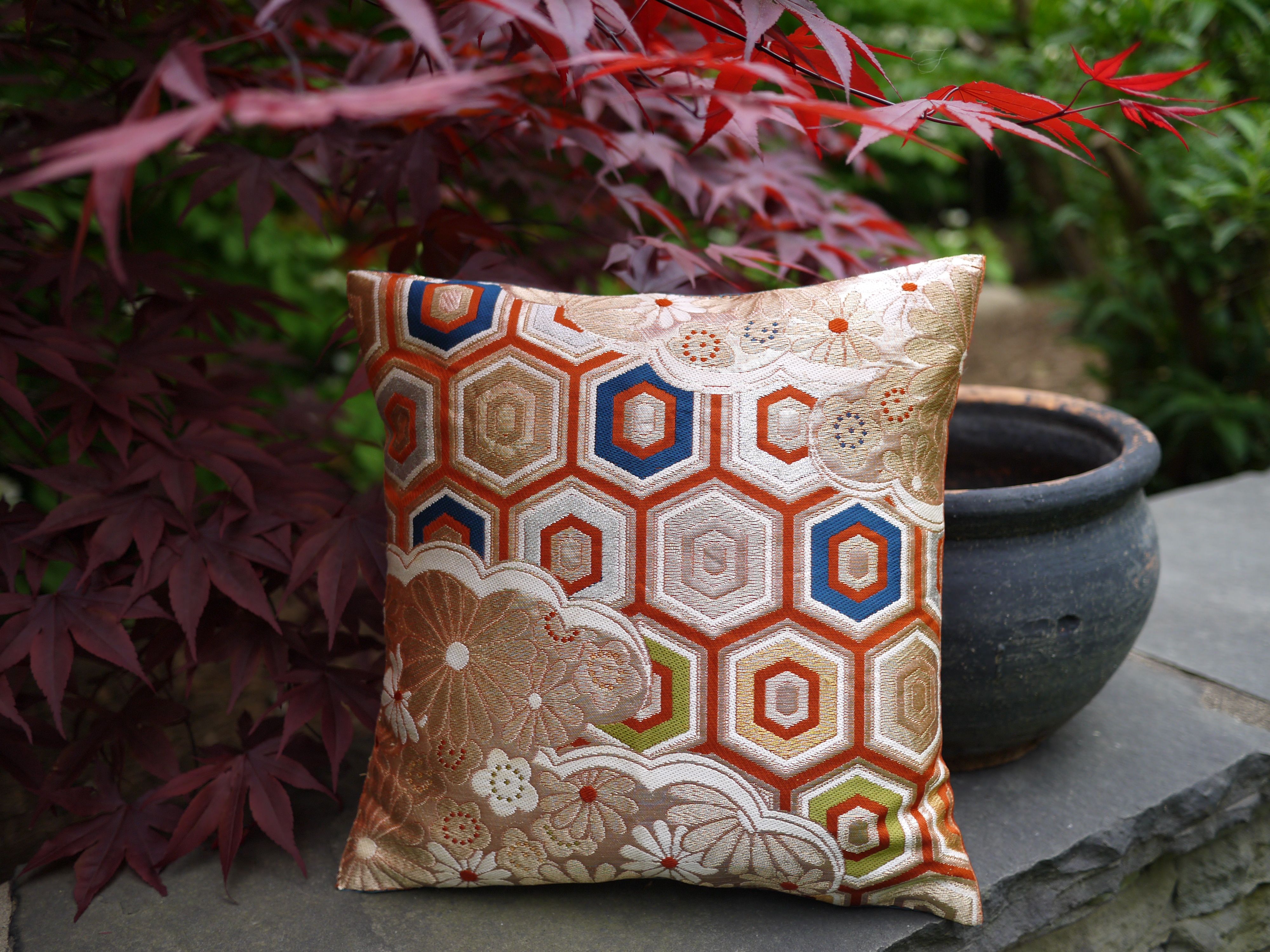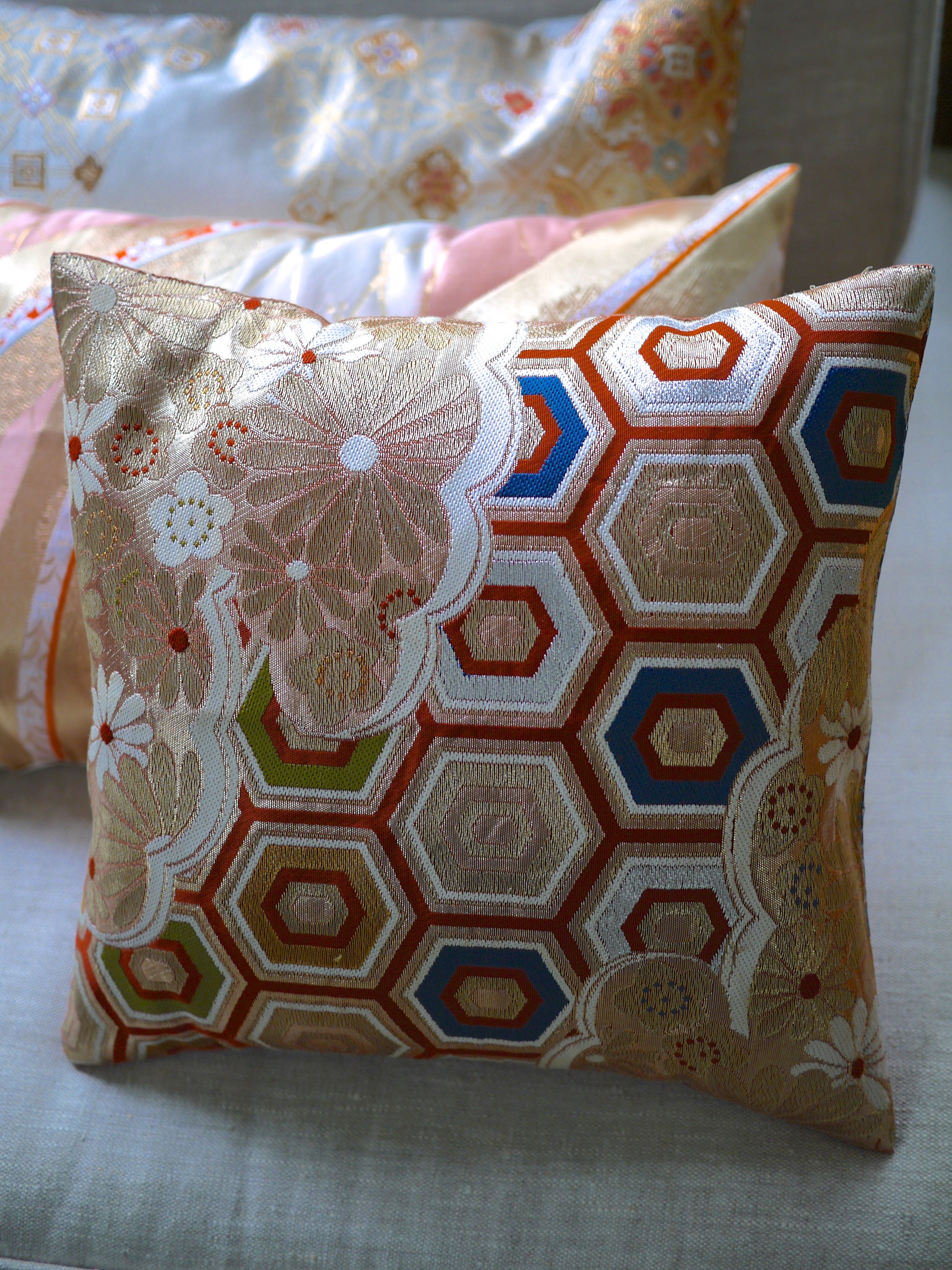 Multicolored, festive silk pillow, edged with gold floral motifs over honeycomb background.